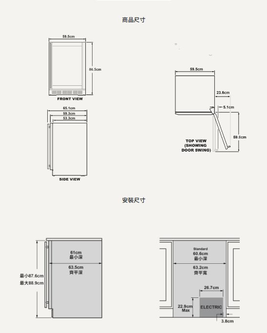 | 商品尺寸 ( 高 x 寬 x 深 ) | 高86.5cm x 寬59.5cm x 機身不含門深度53.3cm |