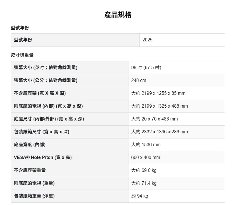 | 螢幕大小 (英吋;依對角線測量) | 98 吋 (97.5 吋) |