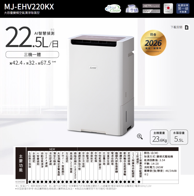 【Mitsubishi三菱】22.5公升 1級能效 大容量變頻空氣清淨除濕型除濕機 (MJ-EHV220KX-TW)