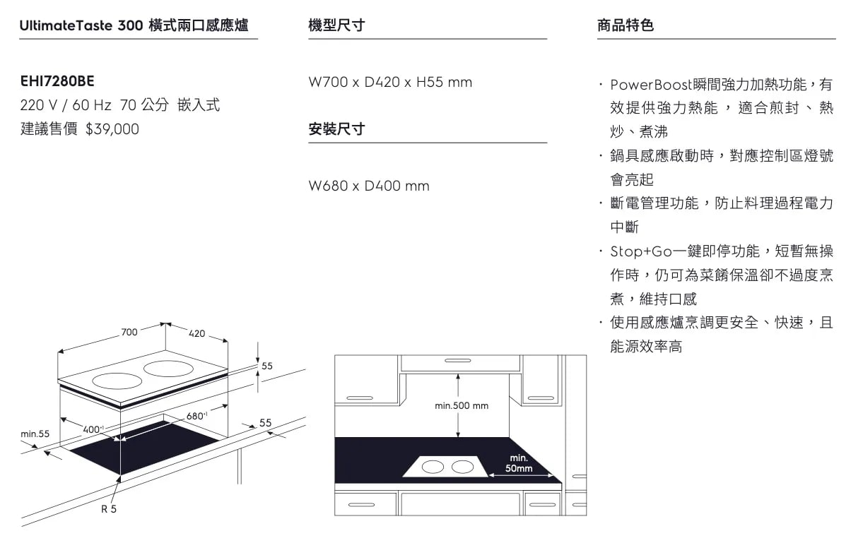 【Electrolux伊萊克斯】70cm UltimateTaste 300 嵌入式兩口感應爐 (EHI7280BE),【祥建家電】一對一家電規劃顧問 | 歐美日韓品牌電器專售 | 線上家電展